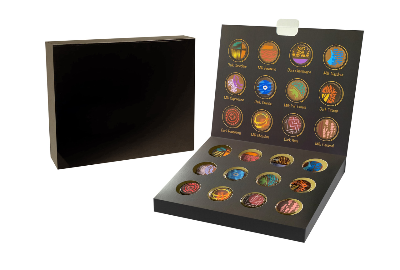 All 12 of our everyday Artisan designs packaged and ready for sale. These gift boxes are sold by the case. One case contains 22 gift boxes, unit price = $12.50 EACH. Gift box can be shipped with our Birnn Branded sleeve or in a blank black box. The flavor ID is part of the box. This option is for no sleeve.