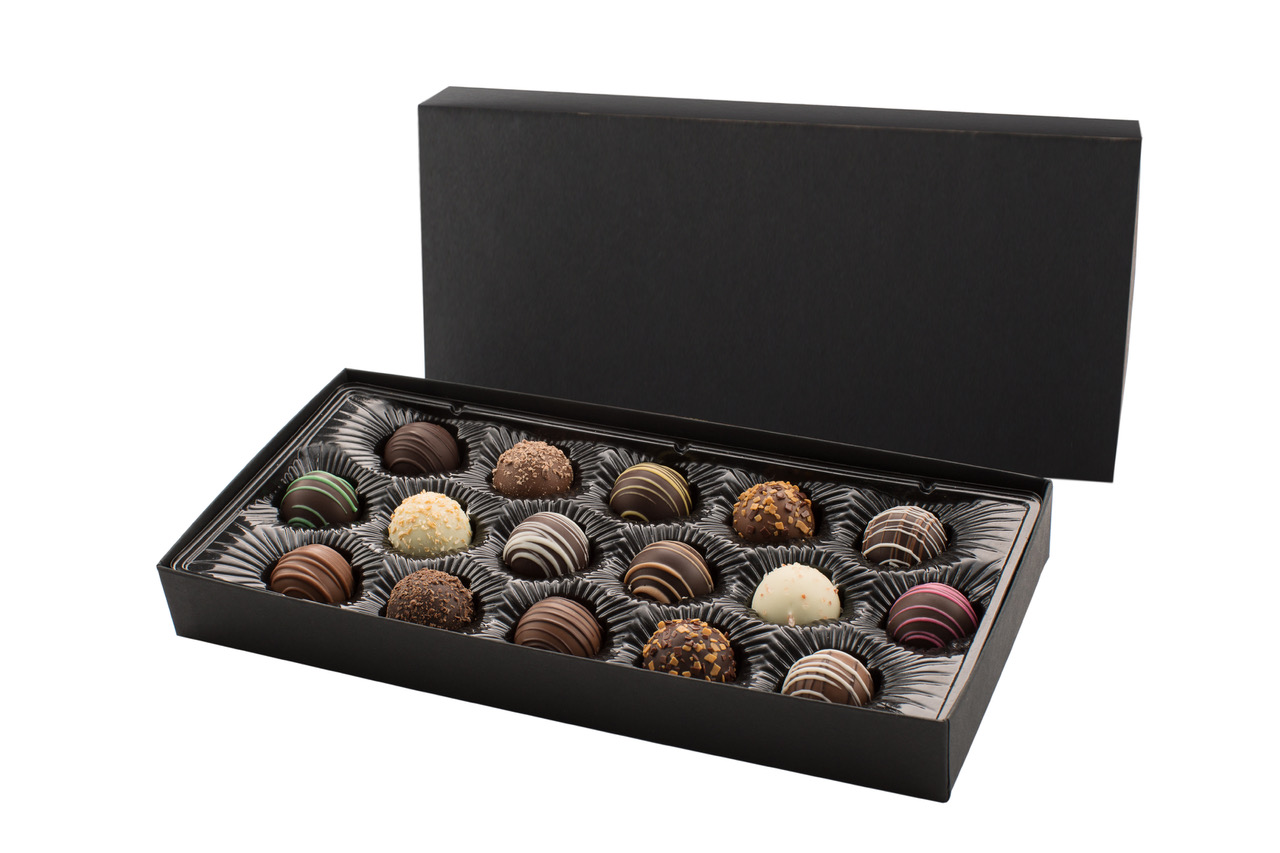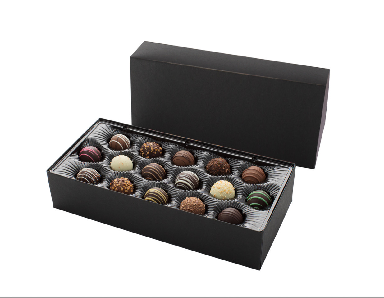 An assortment of our best selling flavors of truffles. Packaged and ready to sell. Includes a flavor ID card. Sold by the case, 18 gift boxes per case. Unit Price = $14.00 Each gift box contains 16 bite size truffles. Appoximately 1/2 LB of truffles.