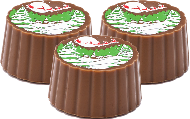 A beautiful scene of Santa’s village with his reindeer and sleigh flying above. This truffle has a white chocolate eggnog ganache. This eggnog truffle will certainly get you in the Holiday Spirit!