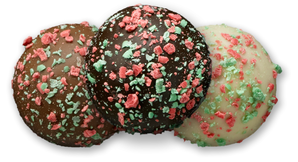 Our first ever dessert size seasonal offering! This delicious holiday tradition is made with a white eggnog ganache and hand decorated with red and green sprinkles. This eggnog truffle will certainly get you in the Holiday Spirit!